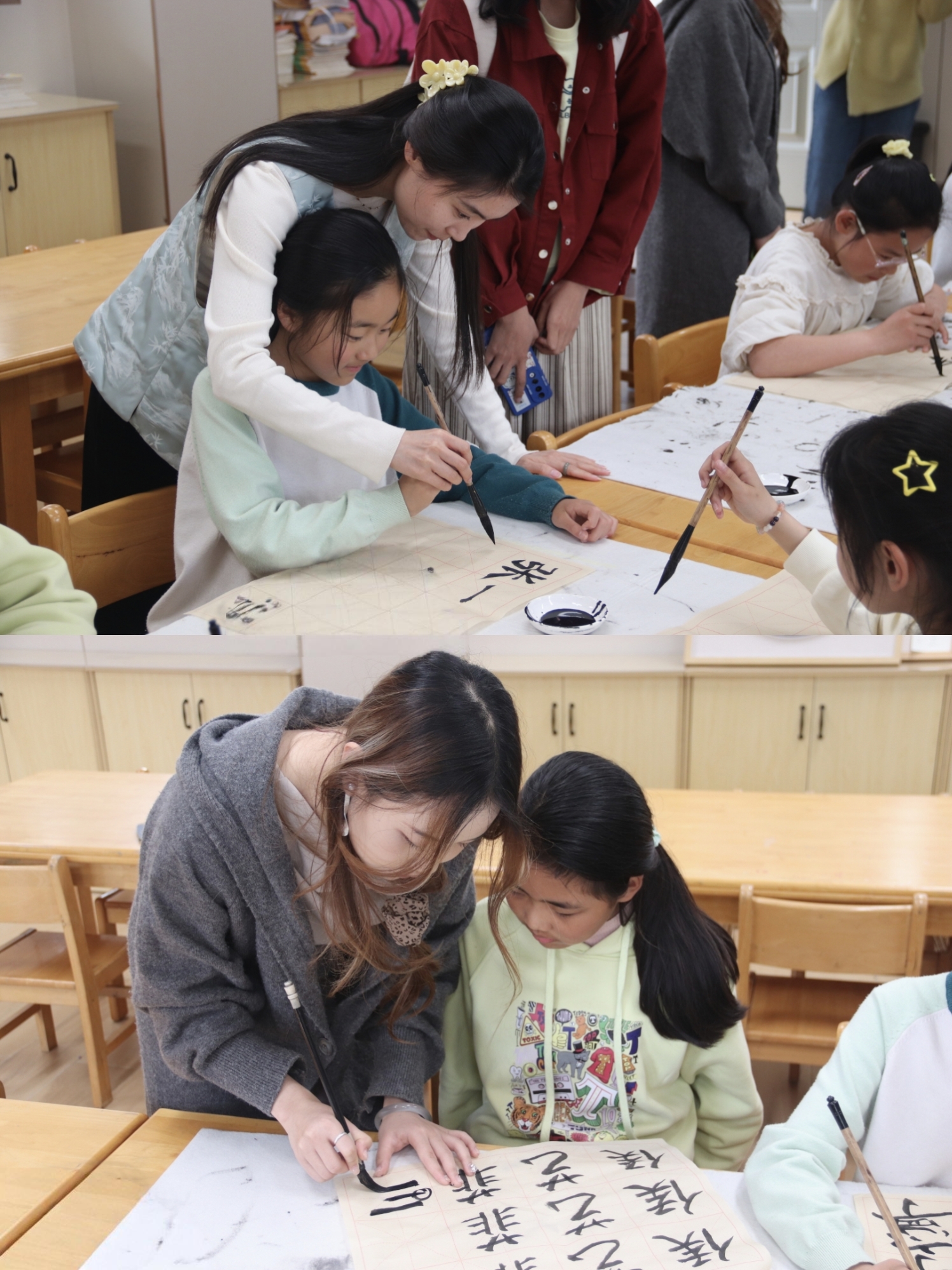 为深入推进大中小学美育一体化建设,引导青少年在传统艺术中涵养人文情怀,4月15日,"大手牵小手 翰墨润童心"书法艺术体验活动在北京东路小学红山分校顺利举行。双方师生代表齐聚一堂,通过座谈交流、签约授牌、书法互动、名家讲座等系列活动,正式拉开大中小体育美育一体化建设的序幕。 活动现场,南京林业大学与北京东路小学红山分校正式签署"大中小体育美育一体化建设"协议,并举行授牌仪式。北京东路小学红山分校校长吴欢与体育美育部党总支书记金钢代表双方学校相互授牌。双方将抓住这一契机,整合各自优质资源,围绕"立德树人"根本任务,构建大中小学相衔接的体育美育育人体系,助力学生增强体质、涵养美感、厚植人文底蕴。 在书法教室里,南林大书法协会的大学生与北小红山分校的小学生们开展了一场别开生面的书法交流活动。大学生手把手教孩子们握笔运腕,小学生则用稚嫩而认真的笔触展示自己的习作。跨越学段的艺术对话,在宣纸上悄然流淌。随后,艺术学院吴勇以"金陵访碑"为主线,为北小师生带来了《翰墨金陵——漫谈南京古今书法》专题讲座。他从六朝以来活跃于金陵的千古风流人物讲起,串联起散落在南京各处街巷、景点的历史碑刻——从梅园新村不灭的灯火,到总统府前"天翻地覆慨而慷"的峥嵘岁月,将书法史与城市史、家国史紧密交织,让师生们深刻感受到家乡深厚的文化底蕴和中国书法五千年的精妙之美。